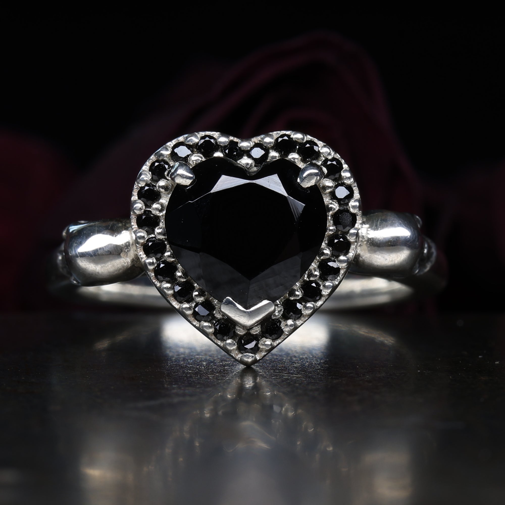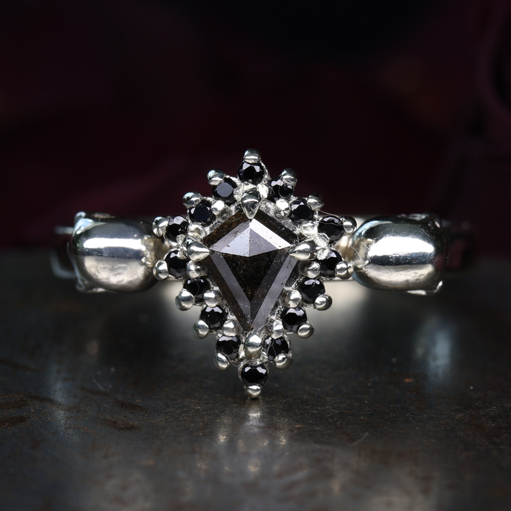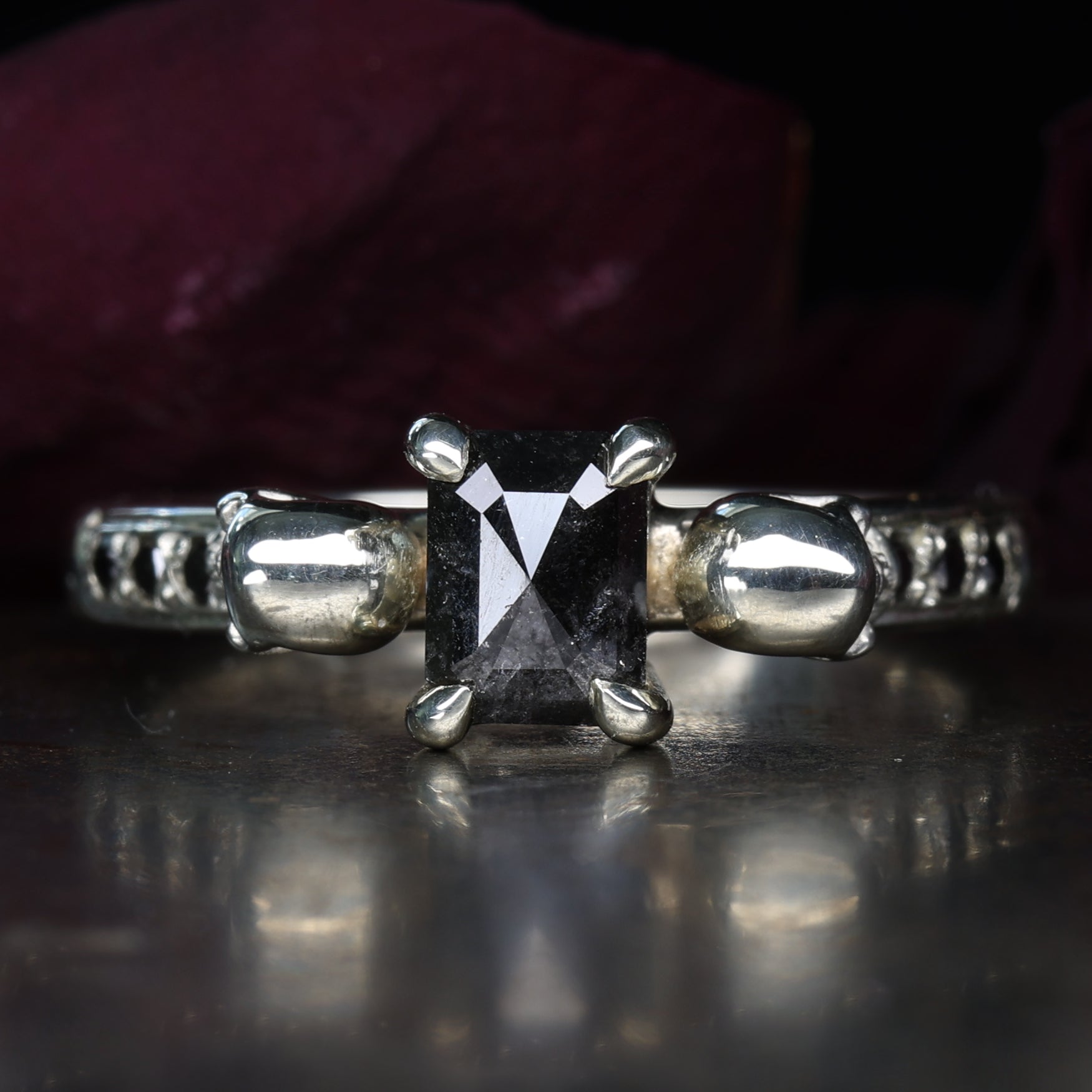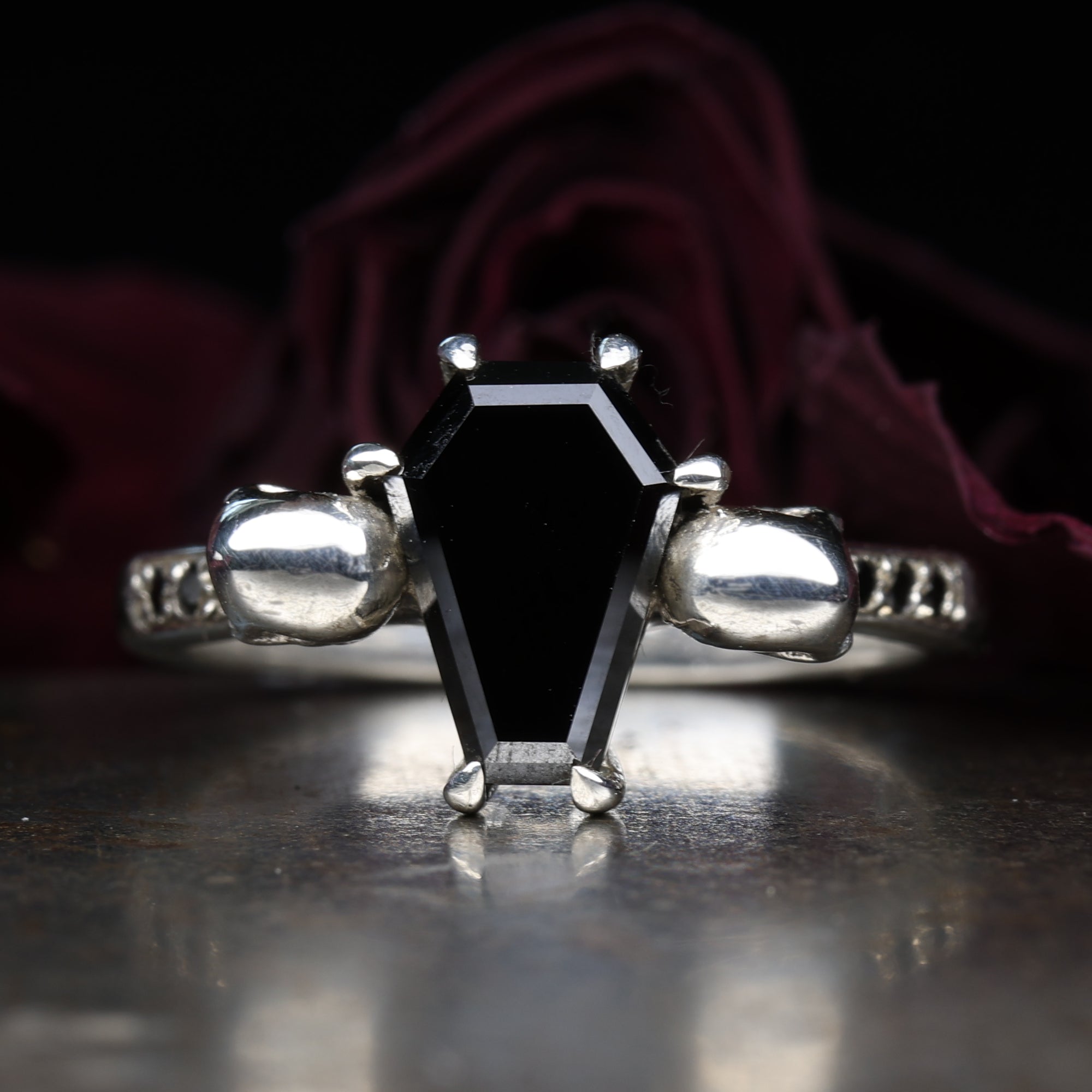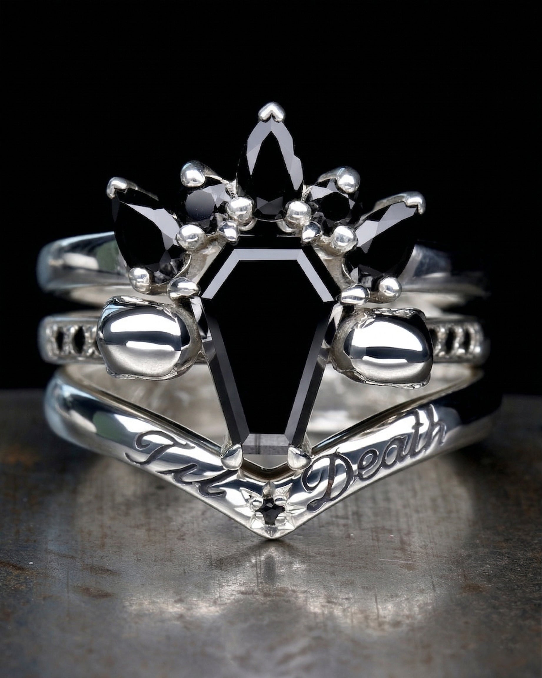 This collection is created primarily with women’s gothic wedding rings in mind—pieces that make a statement, whisper of ancient love stories, and demand to be worn with pride. That said, Hellcat also proudly crafts men’s gothic engagement rings for those looking to mark their commitment with something fiercely personal and undeniably bold.